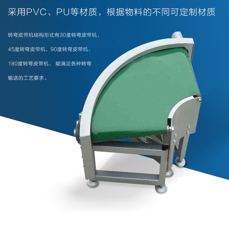 轉彎皮帶輸送機簡稱轉彎皮帶機可30°,45°,90°和180°輸送物料,轉彎皮帶輸送機輸送帶可根據輸送物料的性質選擇PVC、PU材質,除輸送普通物料外,還可選擇滿足耐油、耐腐蝕、防靜電等特殊物料輸送的皮帶材質.
