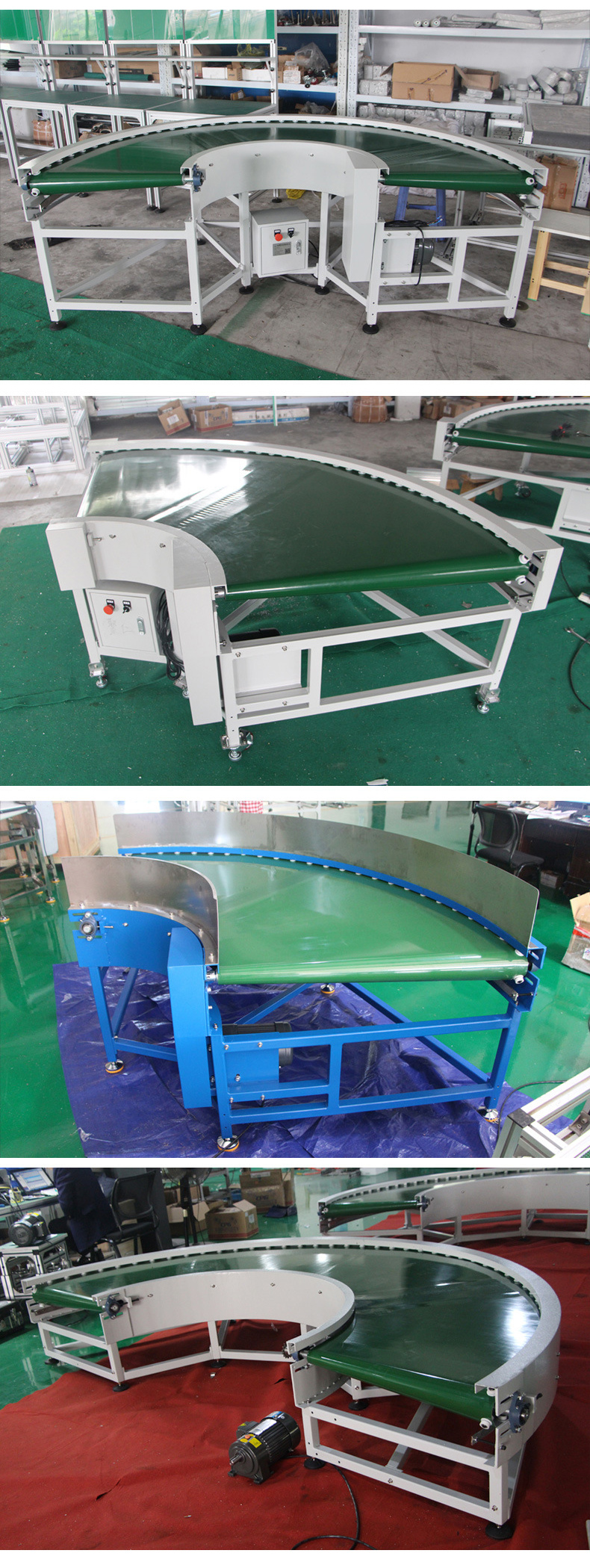 轉彎皮帶輸送機簡稱轉彎皮帶機,是輸送流水線中使用比較廣泛的一種設備,用于輸送帶與輸送帶之間彎角的連續或間歇運動來輸送各種輕重不同的物料,常見的角度為30°,45°,90°和180°,能夠滿足各種轉彎輸送的工藝要求,轉彎皮帶輸送機輸送帶可根據輸送物料的性質選擇PVC、PU材質,除輸送普通物料外,還可選擇滿足耐油、耐腐蝕、防靜電等特殊物料輸送的皮帶材質,轉彎皮帶輸送機機架采用碳鋼或不銹鋼材質制作,驅動電機可根據用戶需求安裝在機架上面或者下面,有速度調節幽囚的用戶還可選擇變頻調速或無級變速減速電機。