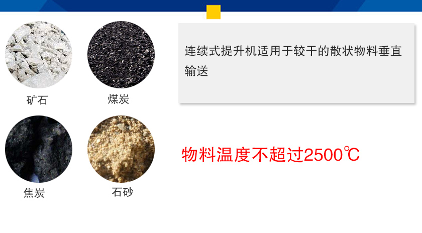 連續式提升機適用于較干的散狀物料垂直輸送,,如礦石、煤炭、焦炭、水泥、石砂等,可廣泛地應用于建材、化工、煤炭、電力、港口運輸等行業的物料輸送作業。