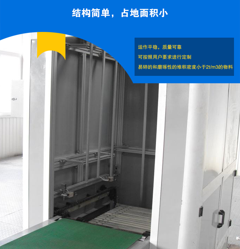 連續式垂直提升機采用板式套筒滾子鏈為牽引構件,料斗固定在鏈板上并連續布置,適用于輸送中等及大塊狀的,易碎的和磨琢性的堆積密度小于2t/m3的物料,物料溫度不超過2500℃.