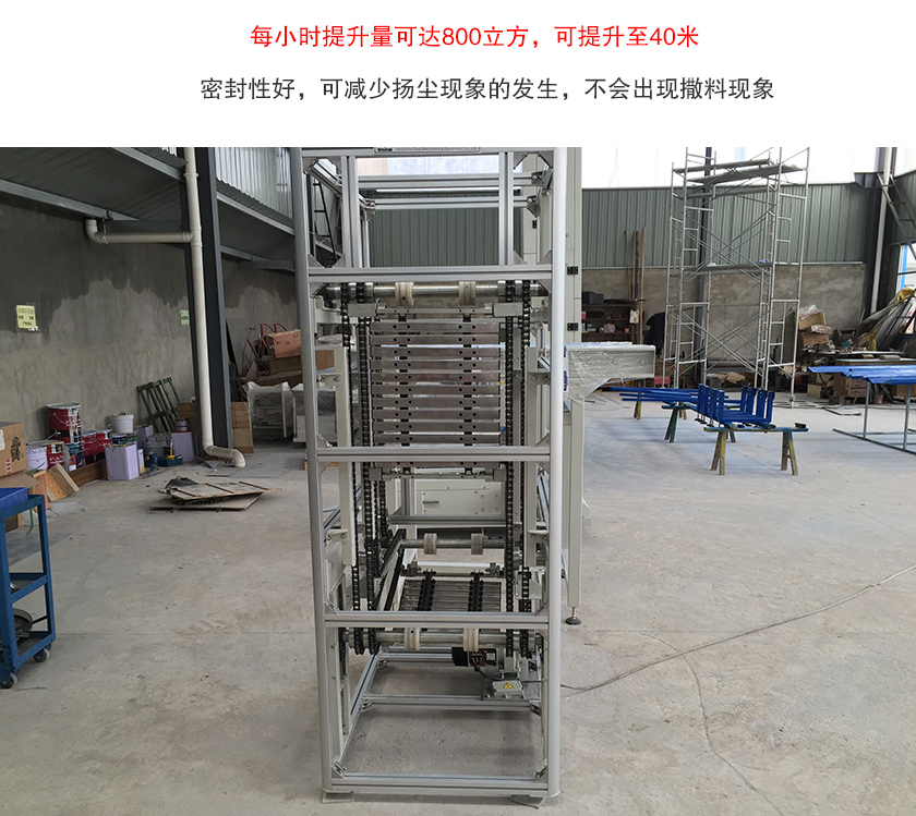 連續式垂直提升機主要由機殼、料斗、牽引件、機身、張緊裝置等部分組成。