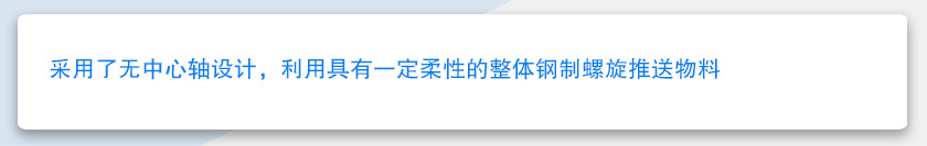 無軸螺旋輸送機可輸送傳統有軸螺旋輸送機和皮帶輸送機不能或不易輸送的物料,如顆粒狀和粉狀物料、濕的和糊狀物料、半流體和粘性物料、易纏繞和易堵塞物料、有特殊衛生要求的物料。無軸螺旋輸送機的性能特點是:無軸螺旋輸送機與傳統有軸螺旋輸送機相比,由于采用了無中心軸設計,利用具有一定柔性的整體鋼制螺旋推送物料,因而具有以上突出優點,性能好。與有軸螺旋輸送機相比,重量和成本都會減少不少。