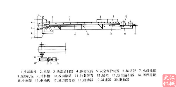 1.驅動部分:系由裝置在型鋼焊成的底座上的電動機-->高速聯軸器-->減速器-->減速聯軸器組成。根據要求:驅動裝置設有左裝和右裝兩種,另外本公司配有功率1.5KW-13KW,速度0.80、1.0、1.25的油冷式電動滾筒。 2.滾動部分:分傳動滾筒和改向滾筒兩大類。 3.托輥部分:分槽形、平行、調心和緩沖托輥等。 4.清掃部分:分彈簧清掃器和空段清掃器。 5.卸料部分:分固定式犁式卸料器和電動卸料器。 6.制動部分:有帶式逆止器和滾柱逆止器兩種。 7.附件:有罩殼、導料槽、漏斗等。