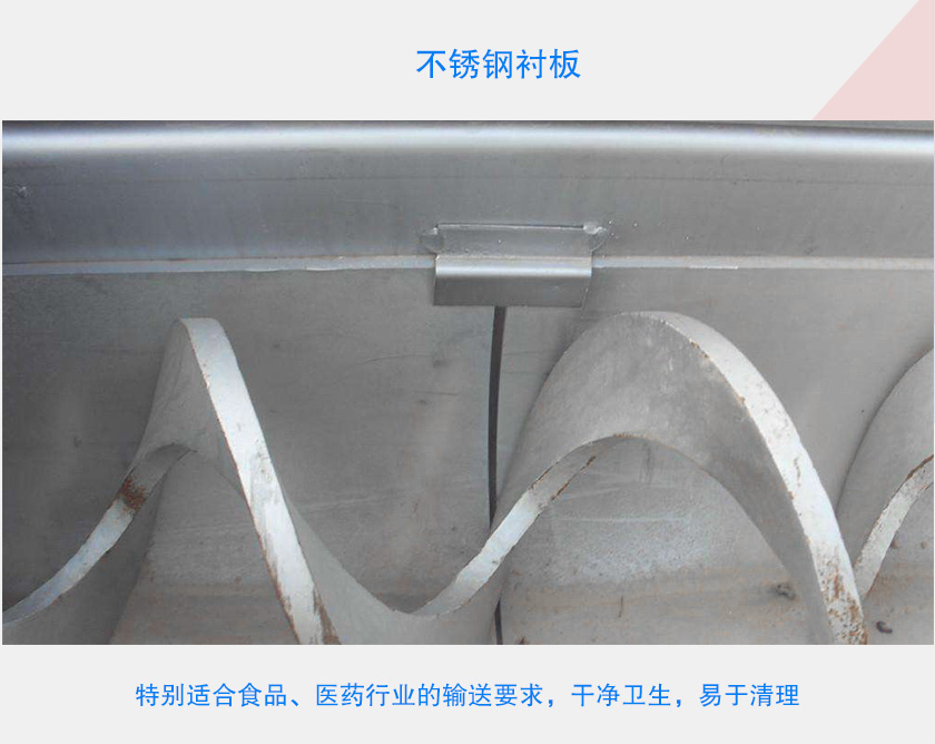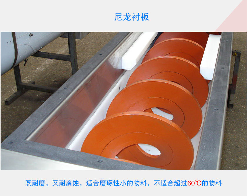 以上是對無軸螺旋輸送機(jī)襯板的介紹,在客戶使用當(dāng)中,可以根據(jù)情況可自行更換襯板,螺旋輸送機(jī)襯板材質(zhì)可依據(jù)用戶需要及輸送物料來選擇。