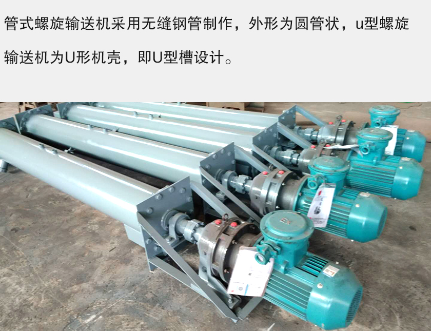 管式螺旋輸送機采用無縫鋼管制作,外形為圓管狀,u型螺旋輸送機為U形機殼,即U型槽設計。