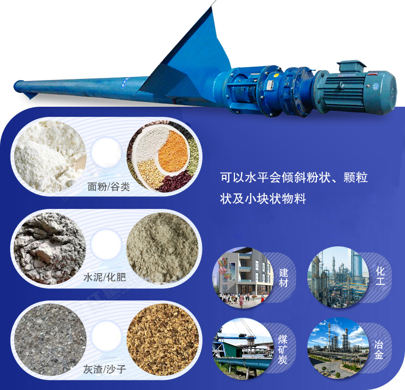 管式螺旋輸送機可以水平會傾斜粉狀、顆粒狀及小塊狀物料,如輸送面粉、谷類、水泥、化肥、灰渣、沙子、石子、煤粉、小塊煤等物料。