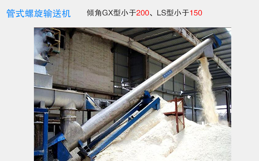 管式螺旋輸送機可布置成水平或傾斜輸送形式(傾角GX型小于200°、LS型小于150°)。